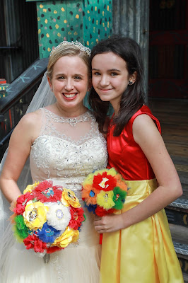 For our wedding colors, we chose red and yellow. It was another way to incorporate our love of Disney, as those are the Mickey Mouse colors! I originally saw a bridesmaid dress in a bridal shop that I loved, but it was expensive. Our bridesmaids were our daughters, so I couldnt see paying almost $200 for a dress that they couldnt wear for long. So I found a pattern I loved, and commissioned Jennifer from Once Upon Your Tshirt to make the girls dresses for me! They were EXACTLY what I wanted and she was amazing throughout the entire process!!!!! Red on top, yellow on bottom, a beautiful open heart on the back, and perfect for their ages! The bouquets I handmade myself out of Disney Pins! You can read HERE about how to do that.